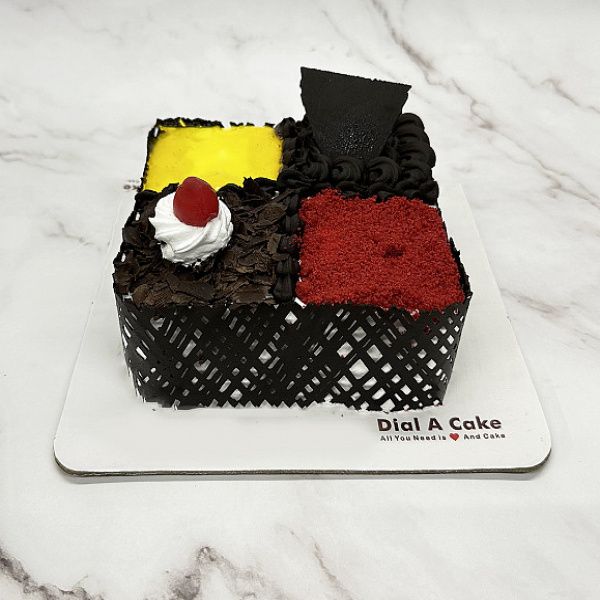 Four flavors clubbed into one cake - Redvelvet, Pineapple, blackforest and chocolate. A must try!